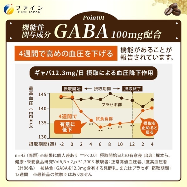 届出番号:I986 機能性表示食品として消費者庁に届出し、受理されています。 機能性関与成分 GABA、イヌリン 届出表示 本品にはGABA、イヌリンが含まれます。GABAには、血圧が高めの方の血圧を下げる機能があることが報告されています。また、GABAには睡眠の質(眠りの深さ、すっきりとした目覚め)の向上に役立つ機能、仕事や勉強などによる一時的・精神的なストレスや疲労感を緩和する機能があることが報告されています。イヌリンには糖の吸収を抑えることで、食後の血糖値の上昇を抑制する機能があることが報告されています。 届出の詳細 より詳細な届出情報を確認されたい場合は、消費者庁の機能性表示食品の届出情報検索にてご確認ください。 https://www.fld.caa.go.jp/caaks/cssc01/
