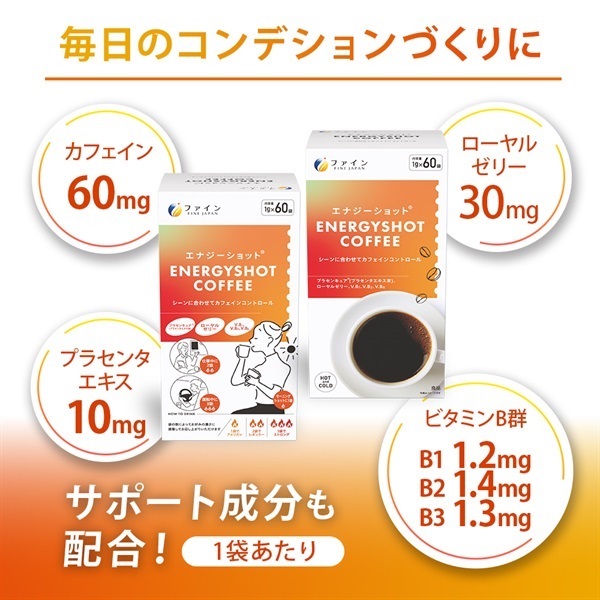 本品はローヤルゼリー、ファイン独自素材のプラセンキュア®(プラセンタエキス末)を配合したコーヒーです。