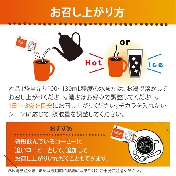 ・そのまま溶かしても、いつも飲んでいるコーヒーに“追いコーヒー”としても使用可能です。