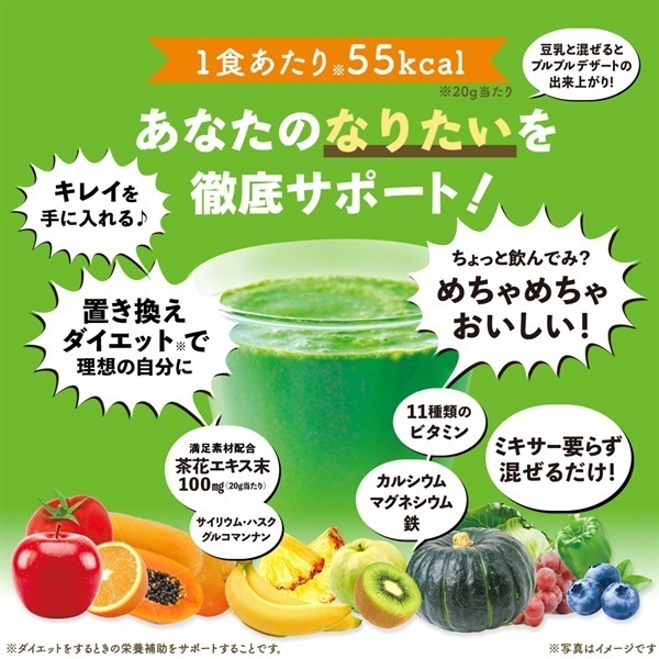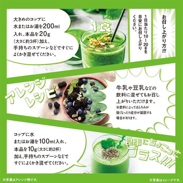 本品を使用すれば水に入れて混ぜるだけ、ミキサー要らずで簡単にグリーンスムージーが完成します。