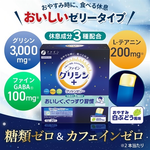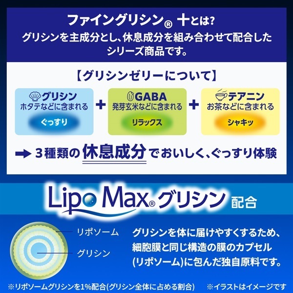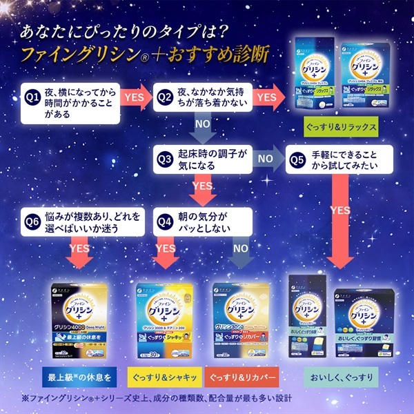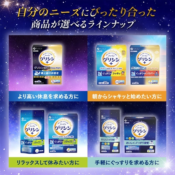 ぐっすりとした休息に「グリシン」、リラックスした休息に「GABA」、シャキッとさわやかな始まりに「テアニン」