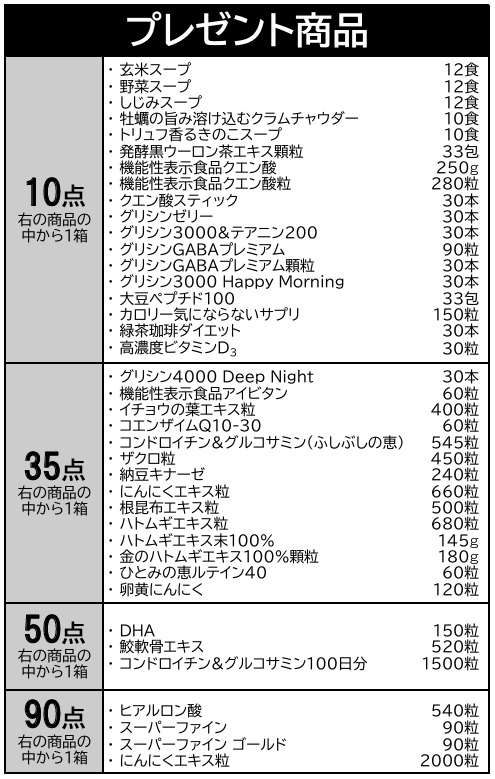 お求めいただきました商品のパッケージに附属している応募券を集めていただき、点数に応じてご希望の商品をプレゼントさせていただきます。